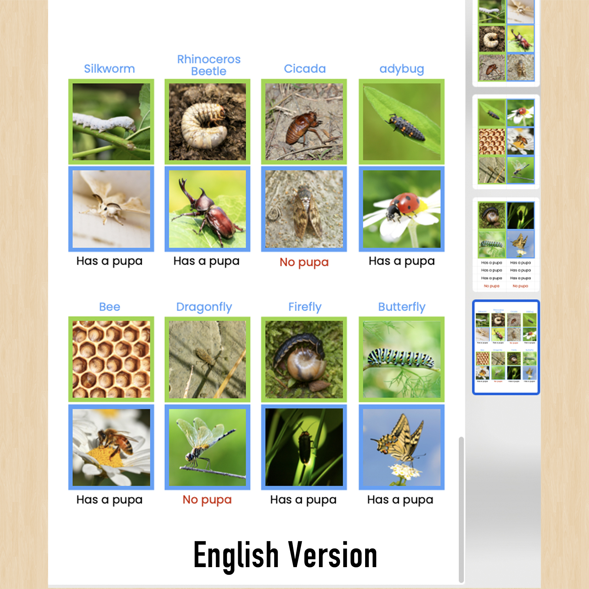 また、「さなぎになる虫」と「さなぎにならない虫」のネームカードもセットにしました。遊びながら、完全変態と不完全変態の違いに自然と気づくことができます。PDFの最後には「間違い訂正板」もあり、間違えても自分で正解と見比べながら学べます。
