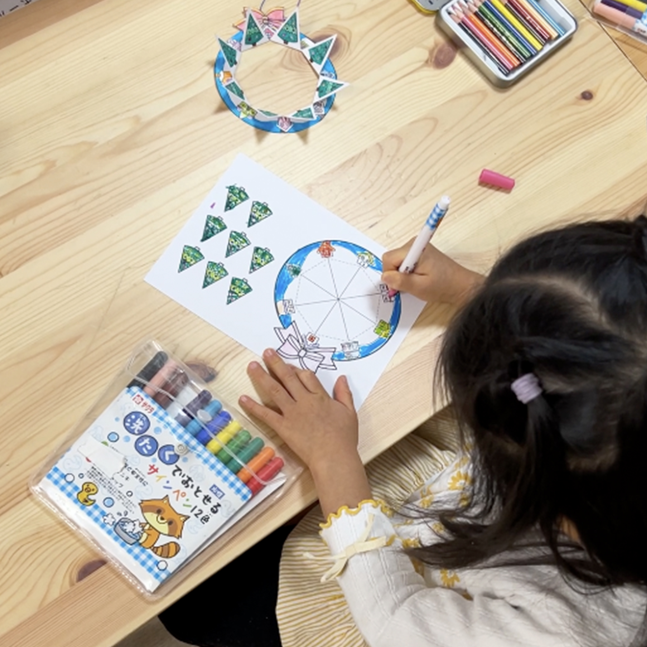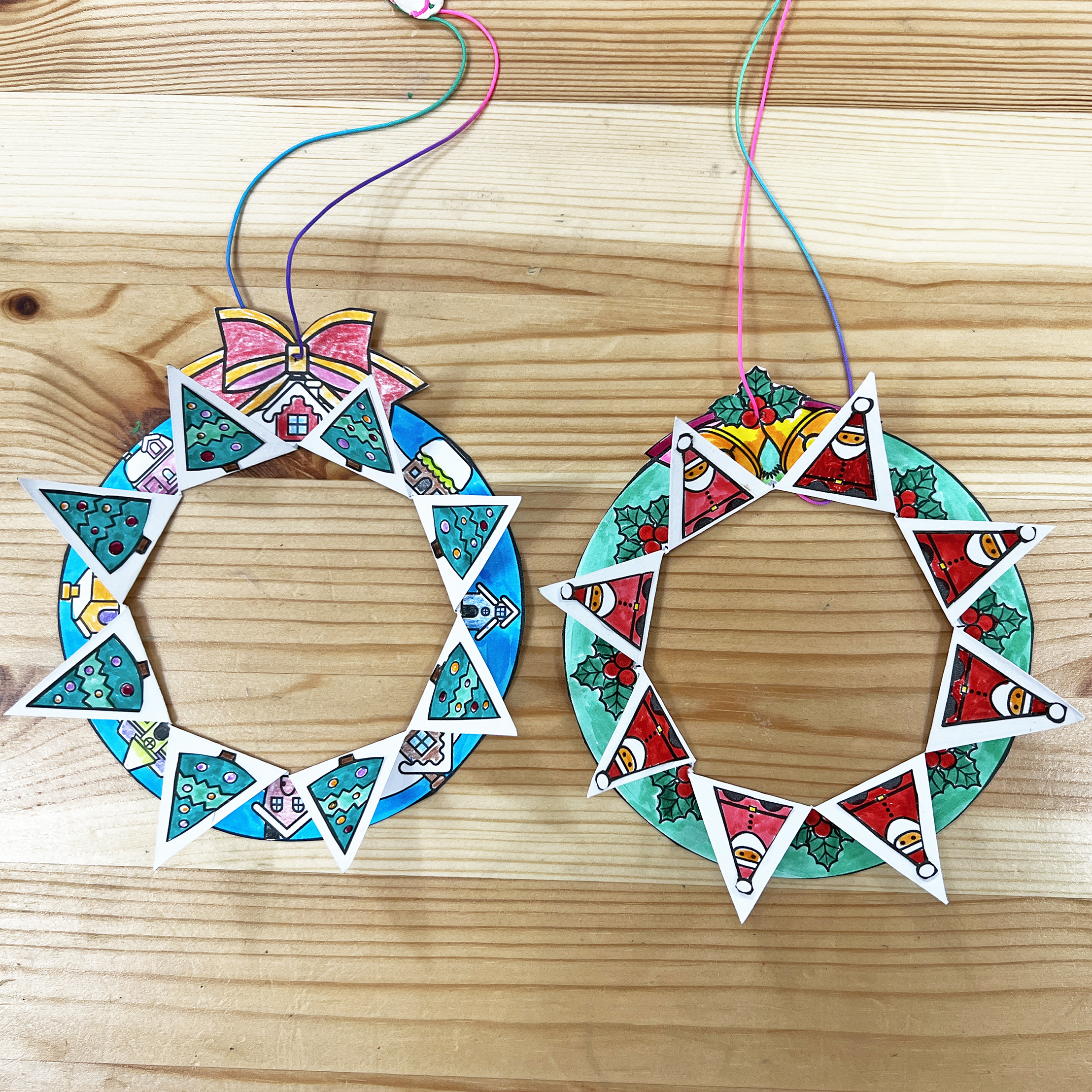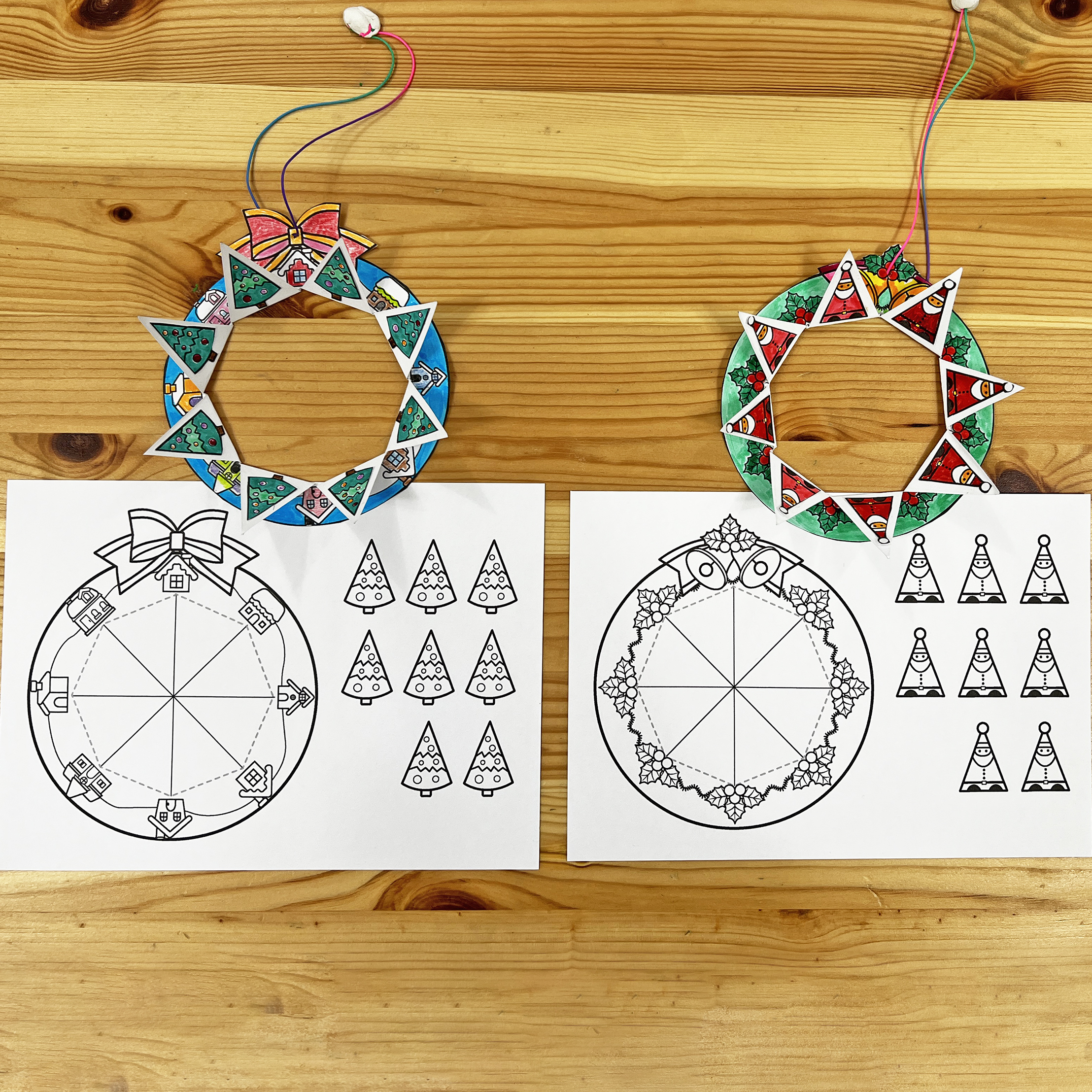 この教材は、リースの土台と8つの三角パーツを「塗る」「切る」「折る」「貼る」という一連の流れで作っていくクラフトです。まずはリースの土台部分と小さな三角イラストを自由に塗っていきます。