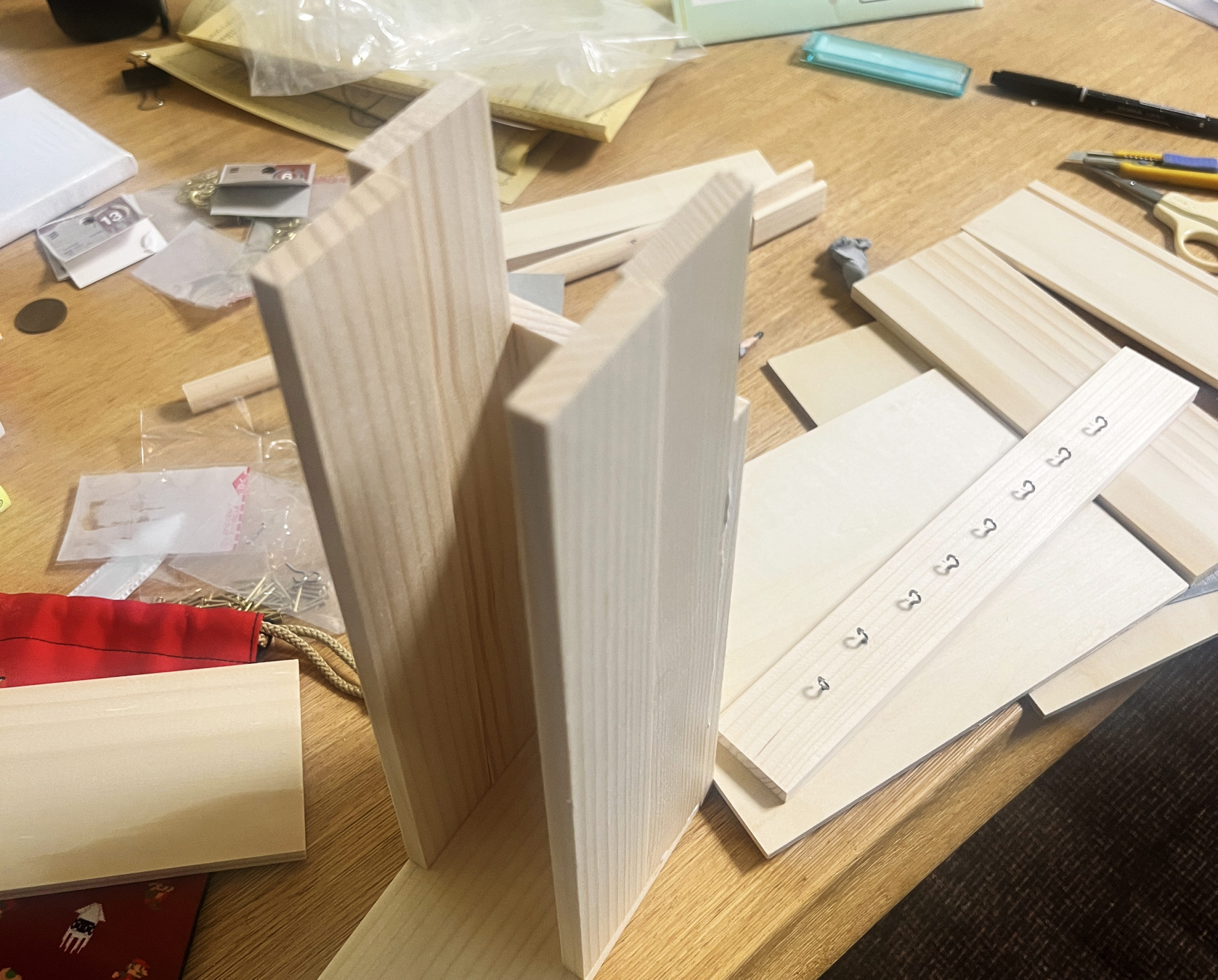 土台となる掛ける部分は、「子どもの夏休み工作キット」みたいなものを購入し、説明書無視して、オリジナルで作ってみました。やすりをかけてニスも塗って完成です。
