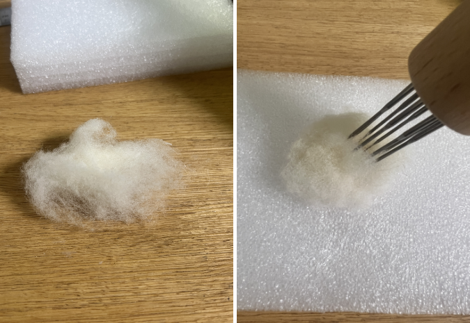 まずは芯となる頭の部分の○だけワタを使って丸く固めていきます。(時間短縮したいのでニードル8本持ち)