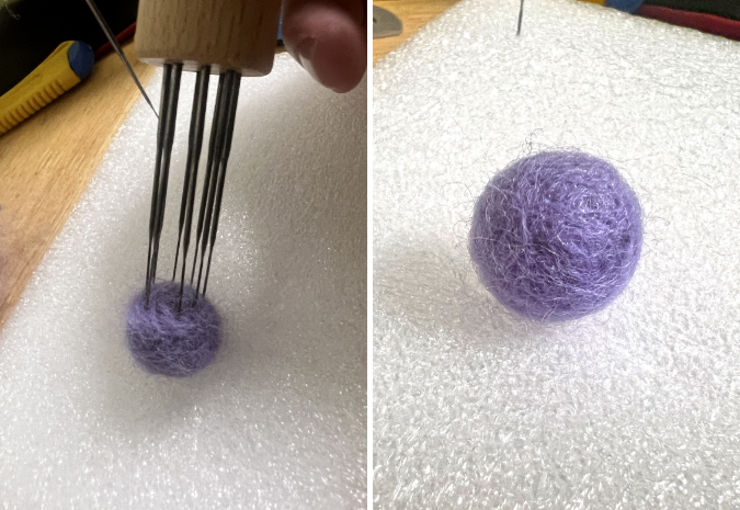 硬くなったワタの球体に色(羊毛フェルト)を巻き付けます。これも最初はニードル多めに刺すと時間短縮になります。