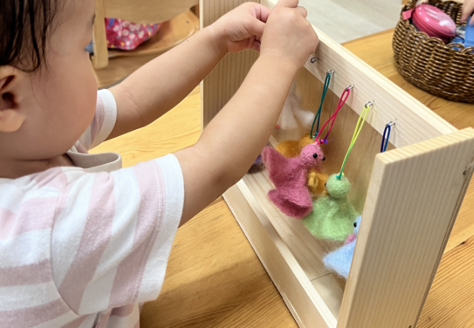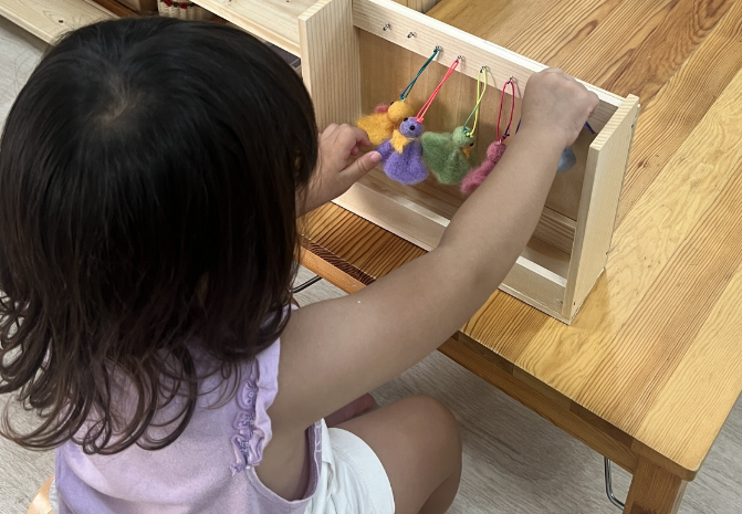 早速、教室の子ども達が活動してくれました。1歳半くらいだとつけるのも外すのもなかなか難しいです。