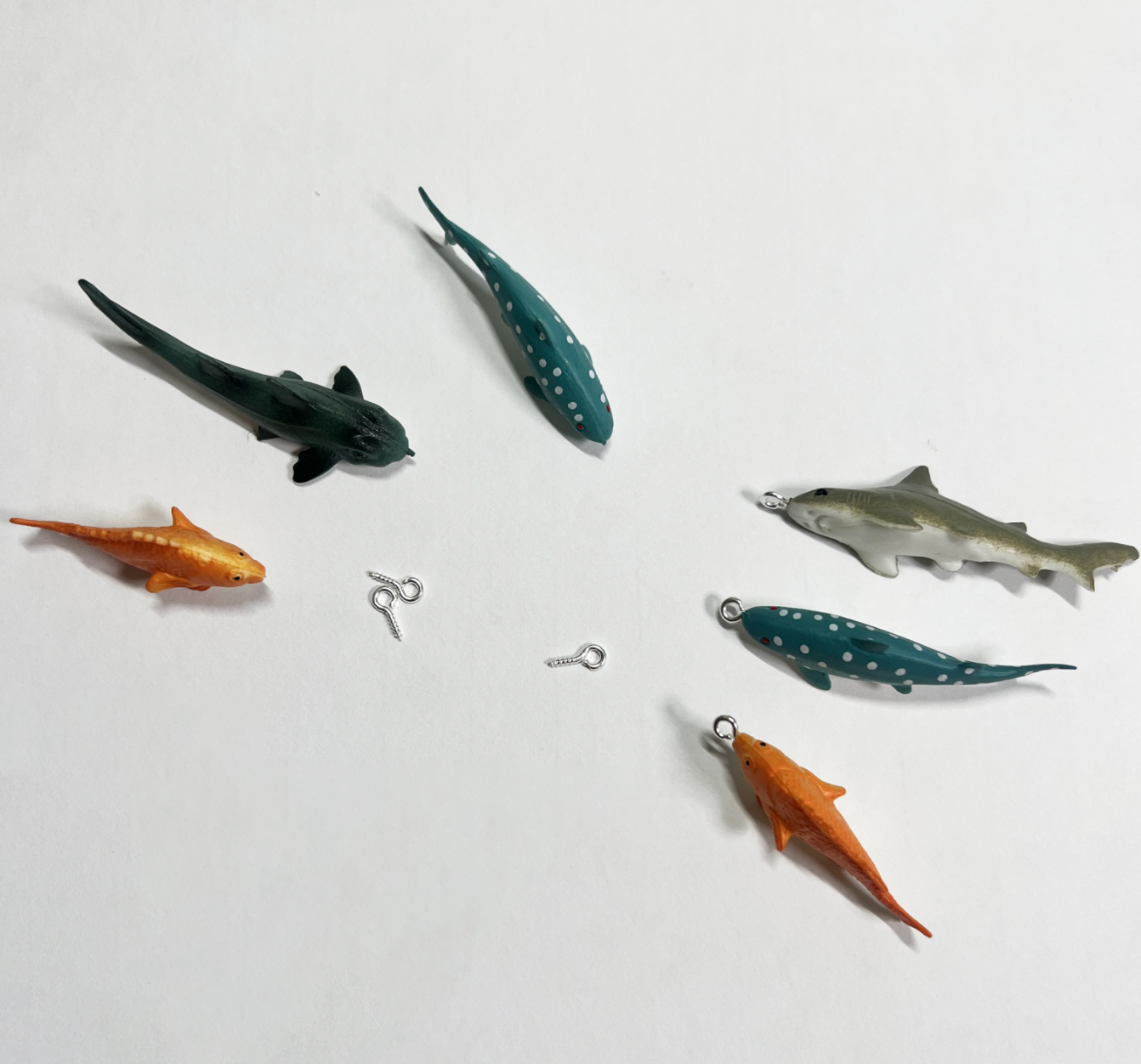 サルカンに付けるものも魚にしたかったので、メルカリで魚のフィギュアを購入し、魚の頭に手芸用ヒートンを手でグリグリねじ込みます。