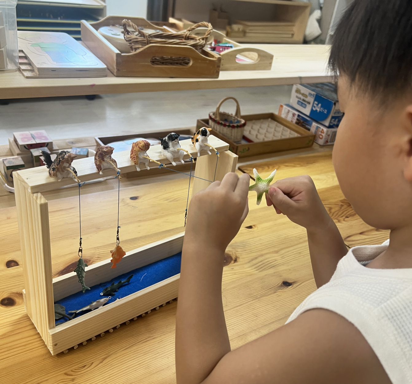 年中・年少さんはまだ「サルカン」を外せませんでしたが、「サルカン」は外した状態でも、細い部分に魚をつけることは簡単にできないので、とても集中できますよ。