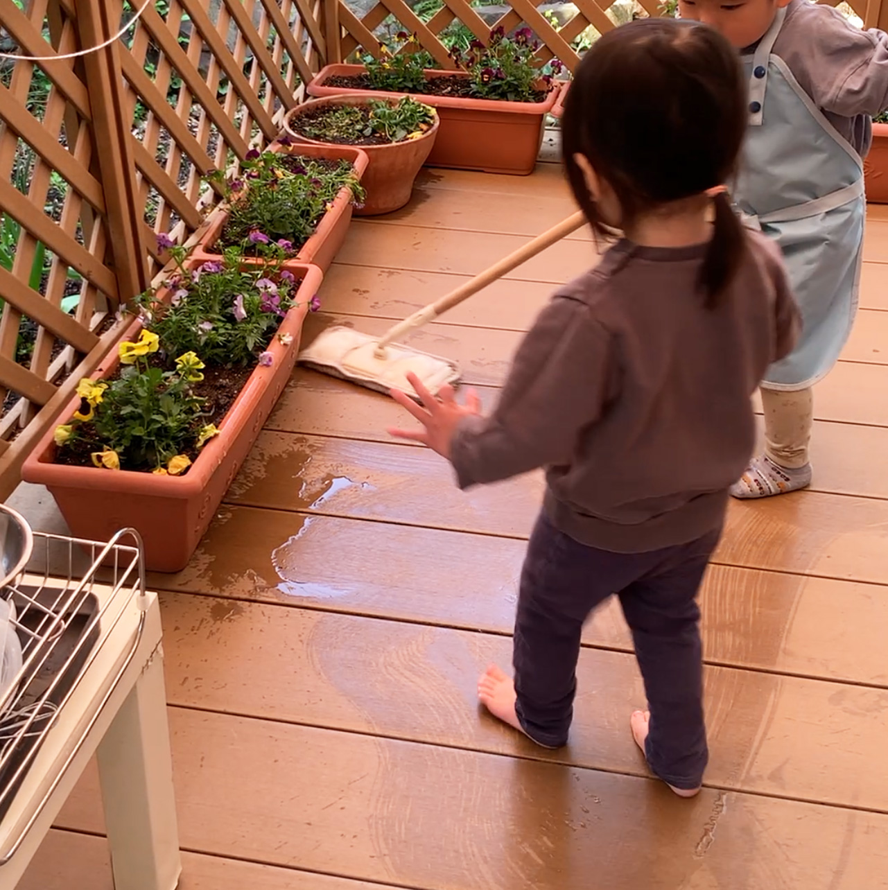 2歳2ヶ月の女の子がテラスでお花に水をあげていたところ、こぼしてしまい水浸しに…💦