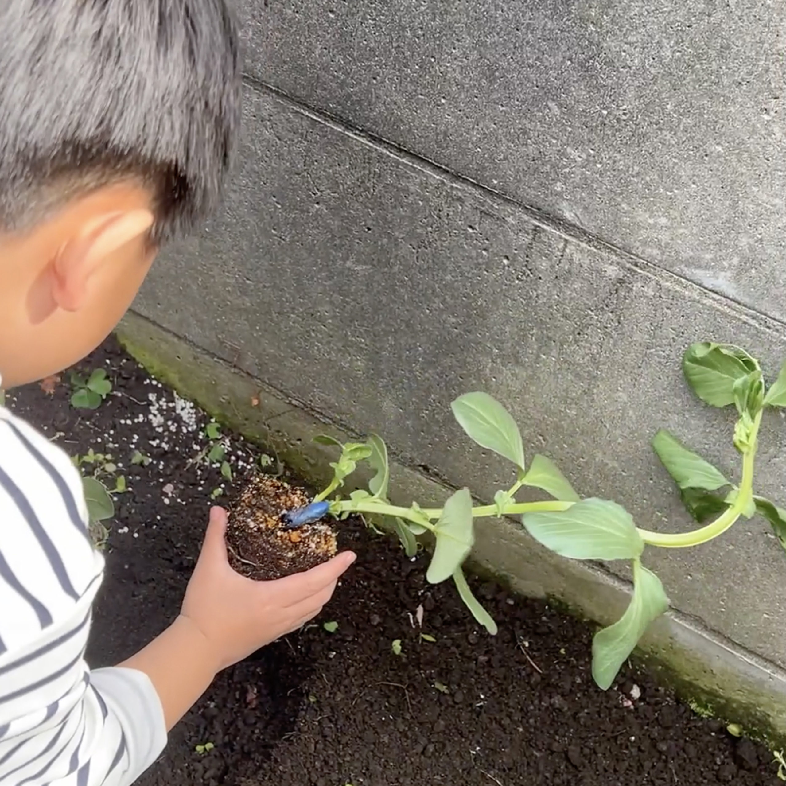 穴を掘って優しく苗を入れたら、そっと土のお布団をかけてあげます✨